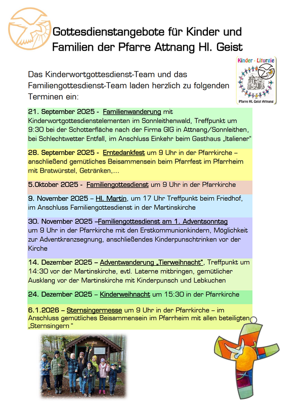 Die Corona-Zeit erfordert gewisse Veränderungen, so hat sich auch der Kinderwortgottesdienst weiterentwickelt. Unsere Treffen finden zukünftig einmal im Monat, meistens am 3. Sonntag im großen Saal um 9:30 im Pfarrheim statt. Alle Kinder von klein bis groß sind herzlich willkommen. Damit wir auf die Abstandsregeln achten können, ist in der „Corona-Zeit“ eine Anmeldung zu den Kinderwortgottesdiensten bei Julia Mitterlehner unter folgender Nummer 06769303959 erforderlich. Um immer am neuesten Stand zu sein, haben wir eine WhatsApp-Gruppe gegründet. Wir kündigen darin regelmäßig die bevorstehenden Kinderwortgottesdienste und Veranstaltungen für euch an, bzw. begleiten euch damit durchs Kirchenjahr. Wer der WhatsApp-Gruppe beitreten möchte, darf sich gerne bei der oben genannten Telefonnummer melden.