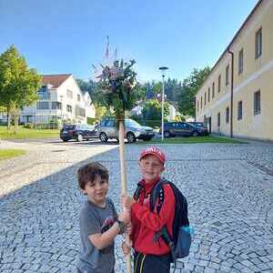 Um die 30 Personen folgten der Einladung der Kinderliturgieteams Eidenberg und Geng und pilgerten am Sonntag, 13. Juli im Morgentau los. Mit Gottes Segen und einem Heilkräuterbuschen am Wanderstab schafften wir den ersten Anstieg zur Eidenberger Alm. Dort gab es im Wald die erste Pause und Aufgabe. Genau schauen! Die Tiere und Pflanzen, an denen wir sonst achtlos vorbeilaufen, wurden beobachtet und Danksätze an Gott formuliert. Bald darauf erreichten wir die Schönangerkapelle, wo wir eine kurze Andacht feierten.